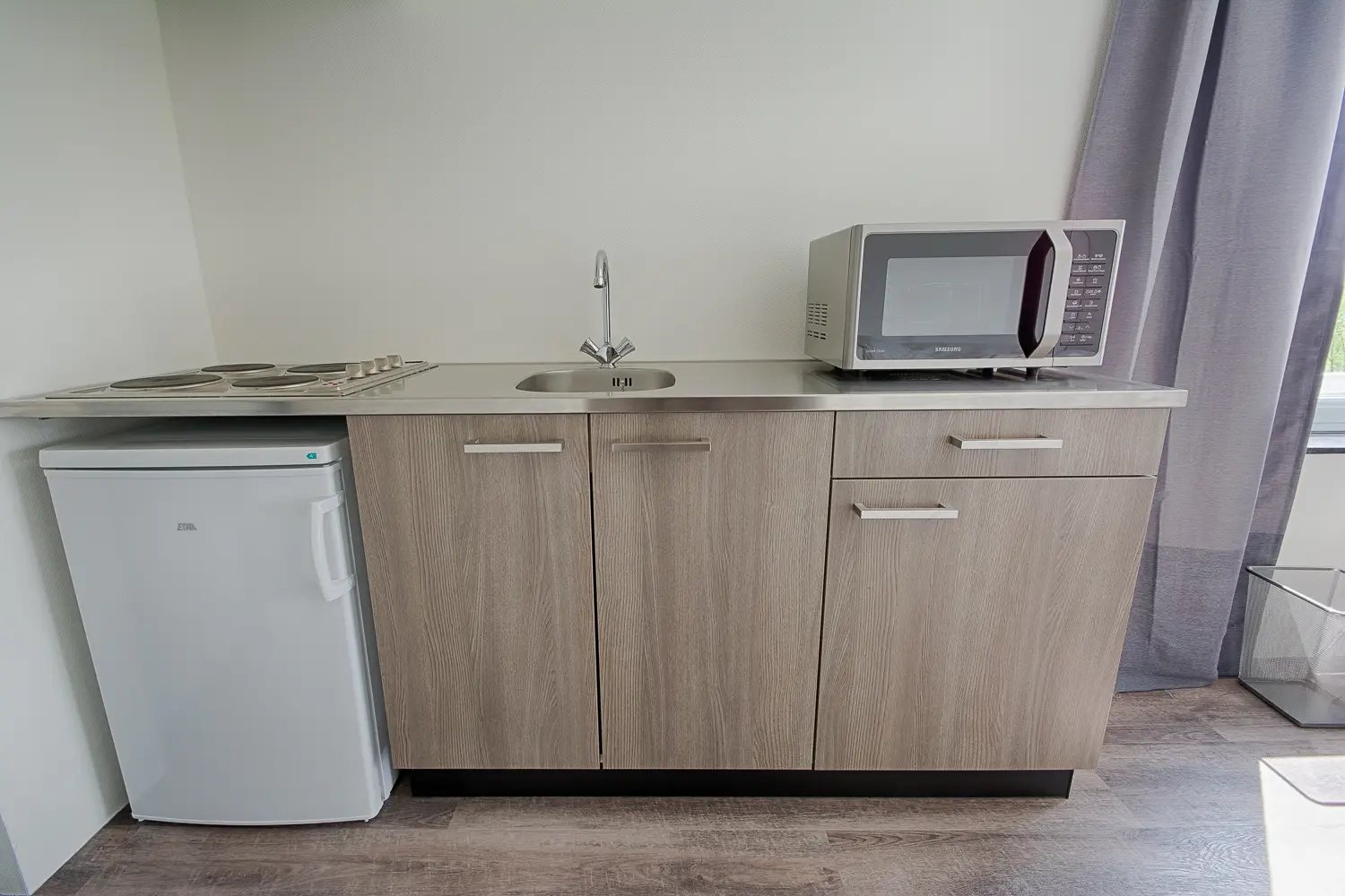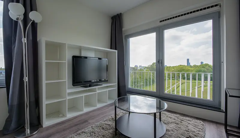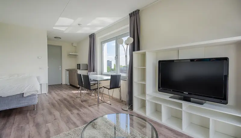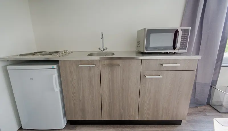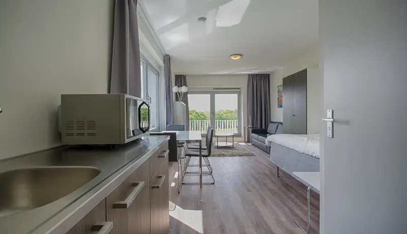 This beautiful Studio in building C is part of the campus of the NHL Stenden Hogeschool in Leeuwarden. You will find a fully furnished open kitchen, a living- and sleeping area. The Studio is equipped with a European double bed and measures 140cm wide and 200cm long. The living area of the Studio is equipped with a dining table, a large wardrobe, and a cozy couch with coffee table as well as a TV.