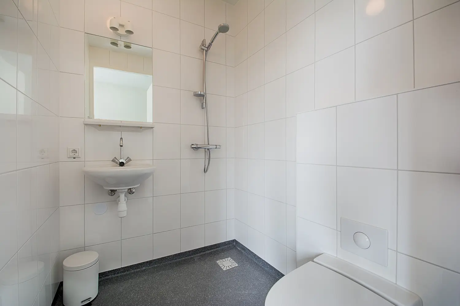 The studio has a separate bathroom with a shower, toilet, and a sink.