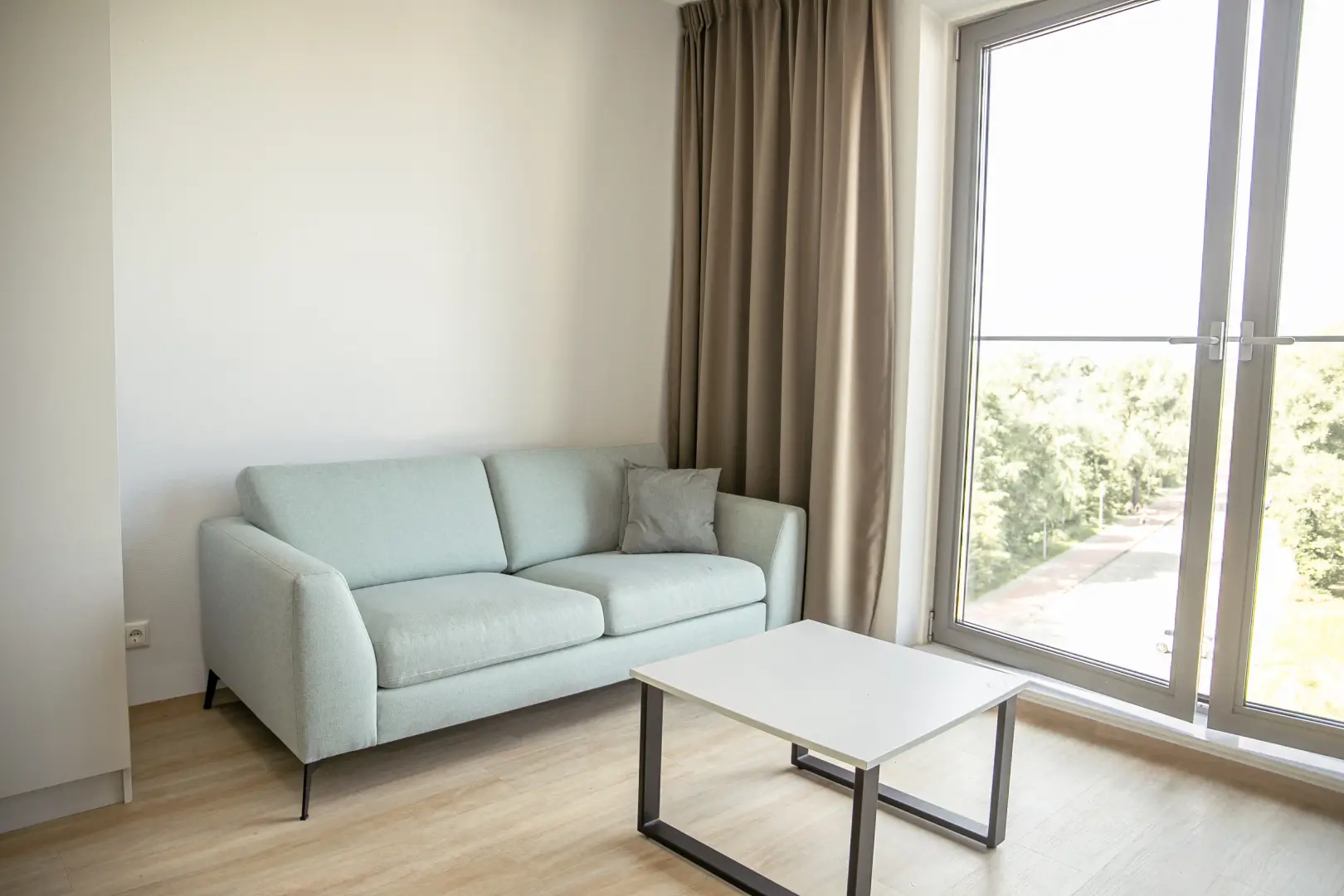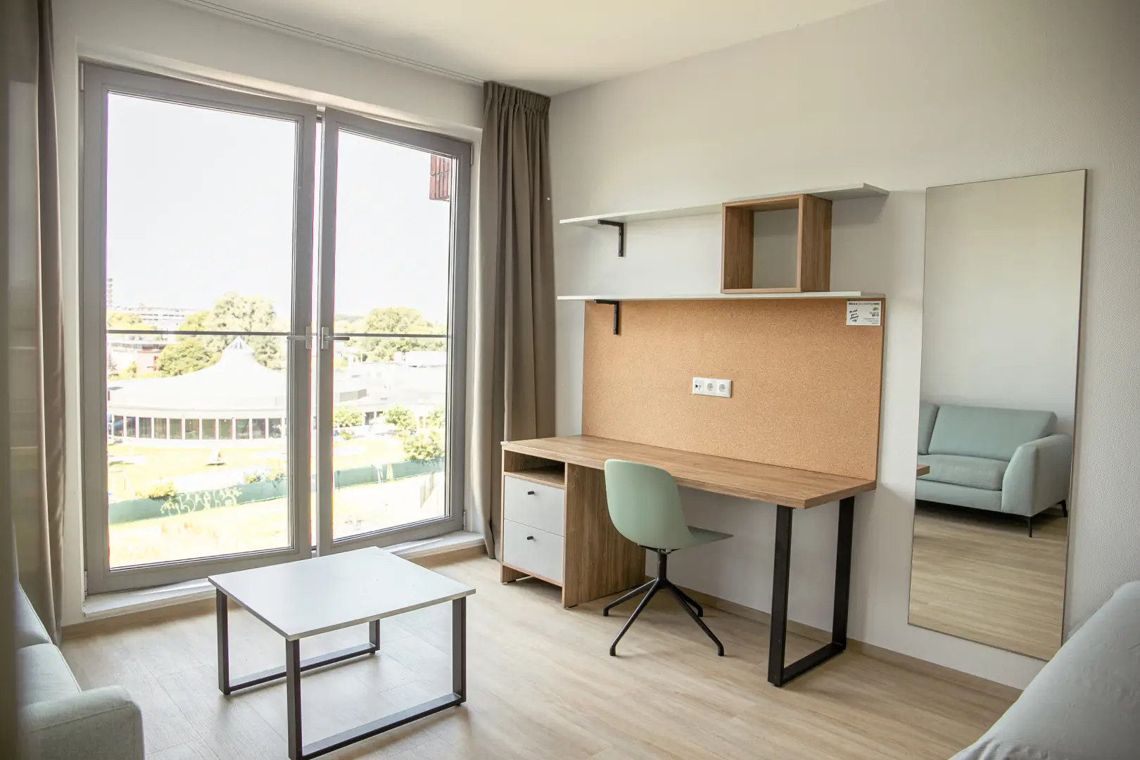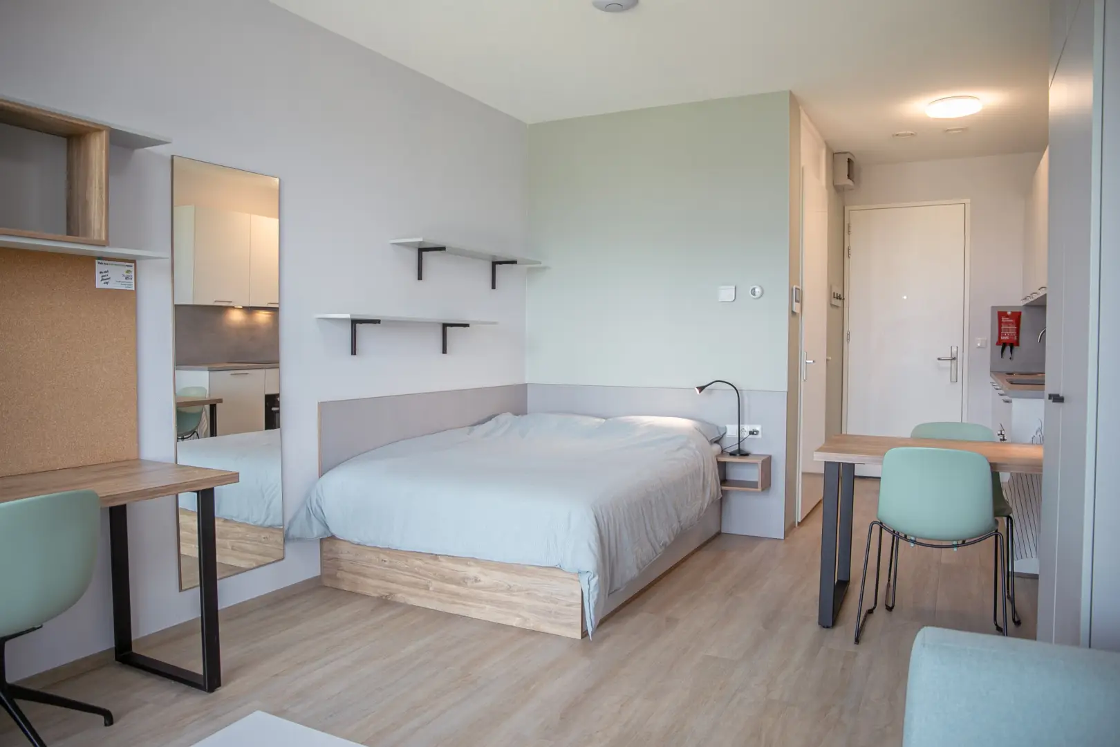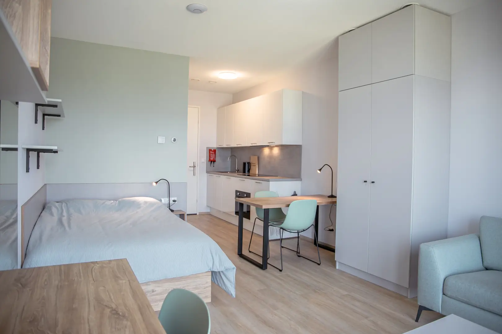 The kitchen is fully equipped with an oven/microwave-combination, stove, sink, refrigerator and a dishwasher. You won’t have to worry about cleaning dirty dishes yourself. Pots, pans and cutlery are not included. This specific Studio has nice, large, inward opening windows with a French balcony This studio has pistachio-green color elements on the wall and furniture. Please see the impression photos to get an impression of how the actual studio will look like.