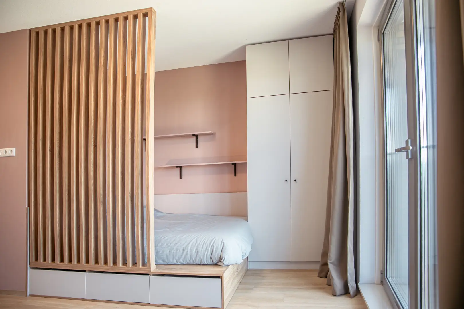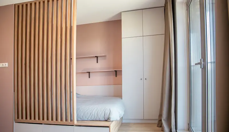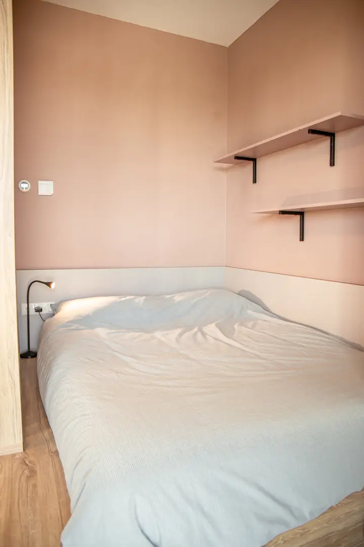 The kitchen is fully equipped with an oven/microwave-combination, stove, sink, refrigerator and a dishwasher. You won’t have to worry about cleaning dirty dishes yourself. Pots, pans and cutlery are not included. This specific Studio has nice, large, inward opening windows with a French balcony This studio has antique-rose color elements on the wall and furniture. Please see the impression photos to get an impression of how the actual studio will look like.
