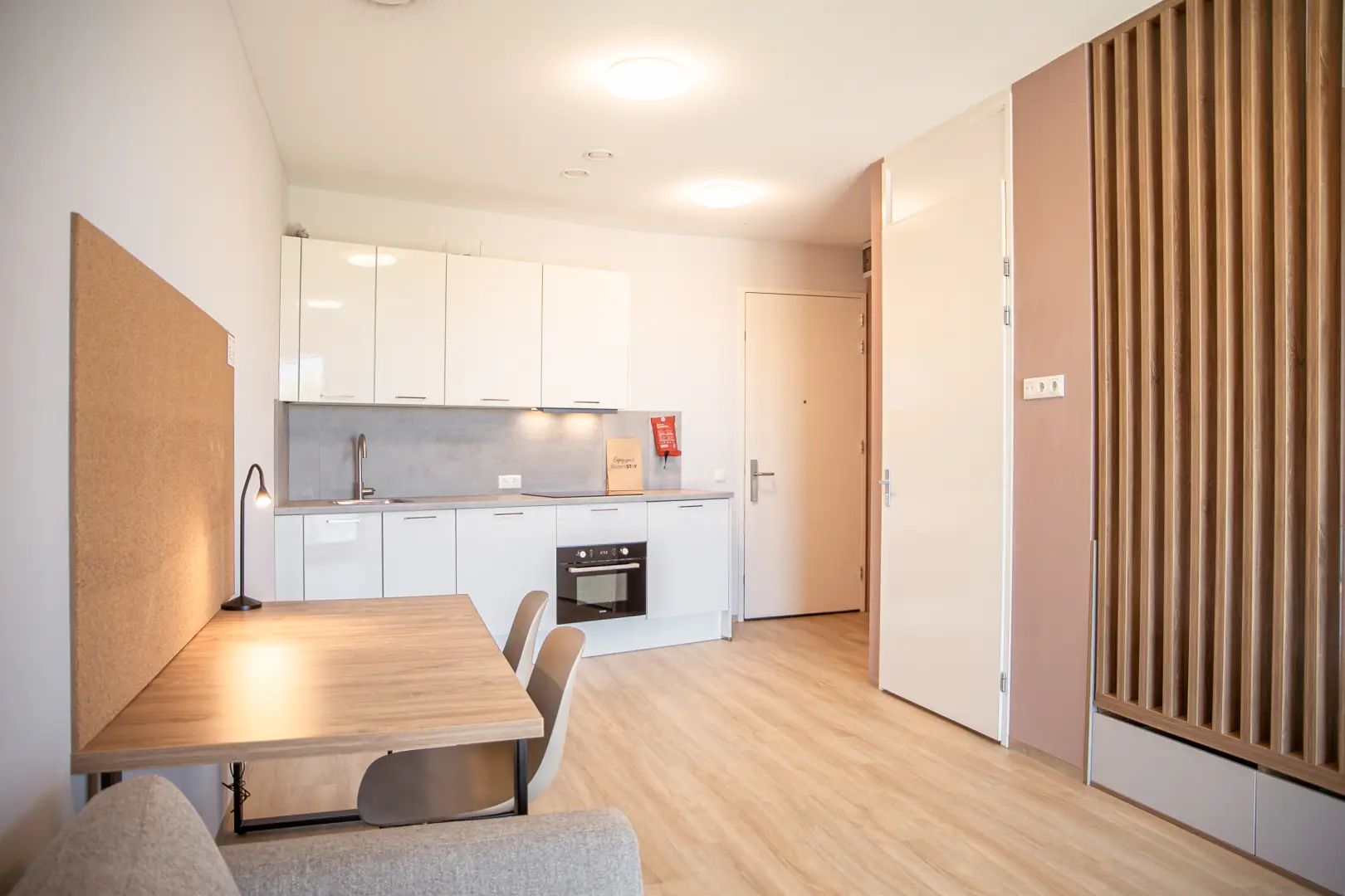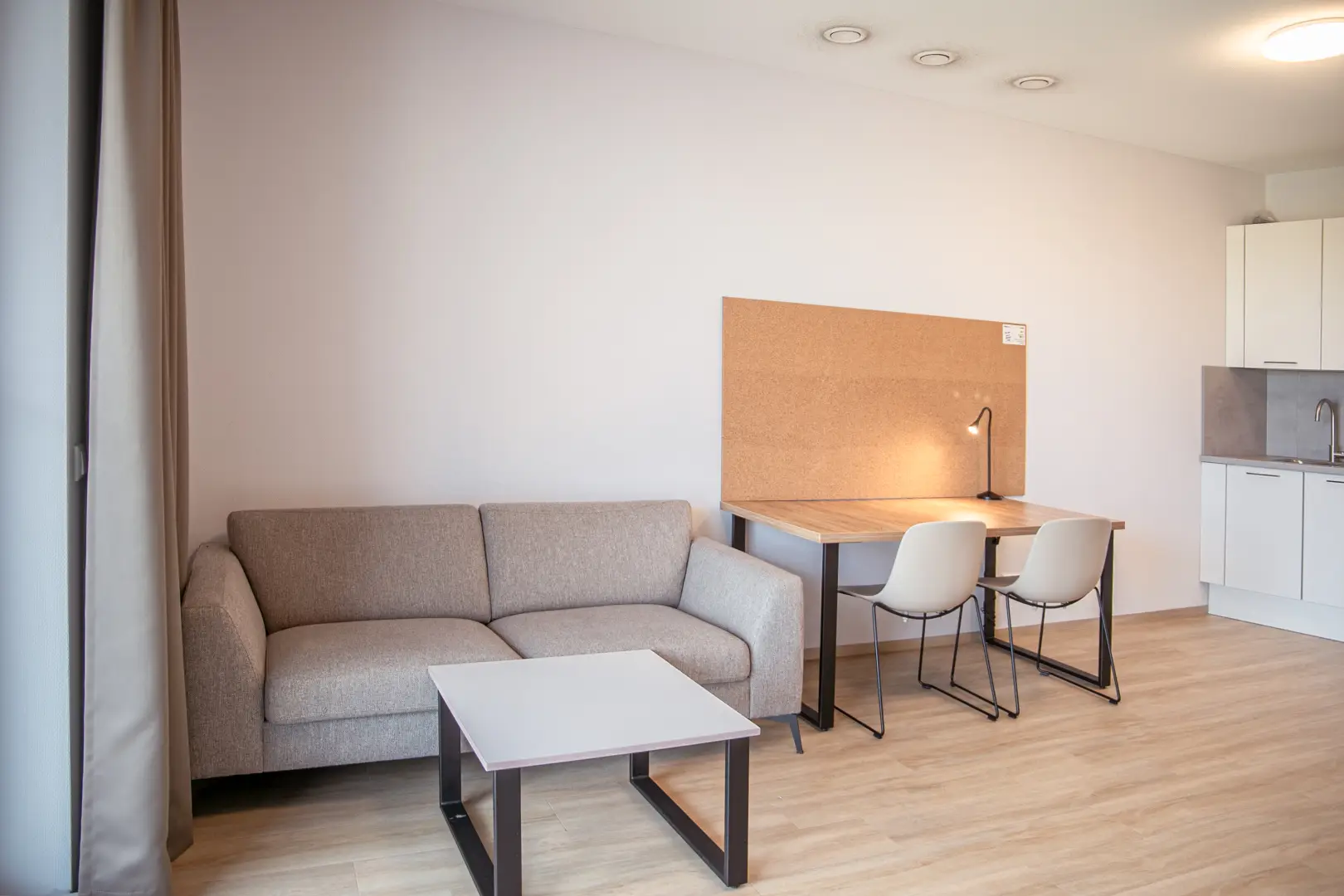 This beautiful Studio in building E is part of the campus of the NHL Stenden Hogeschool in Leeuwarden. You will find a fully furnished open kitchen, a living- and sleeping area. The Studio is equipped with a European double bed and measures 140cm wide and 200cm long. Underneath the bed you will find drawers for extra storage space. The living area of the Studio is equipped with a dining table, a large wardrobe, and a cozy couch with coffee table.