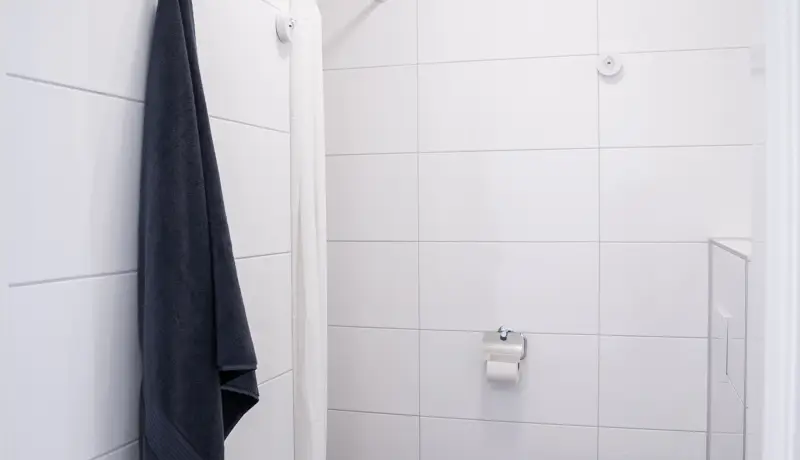 The studio has a separate bathroom with a shower, toilet, and a sink.