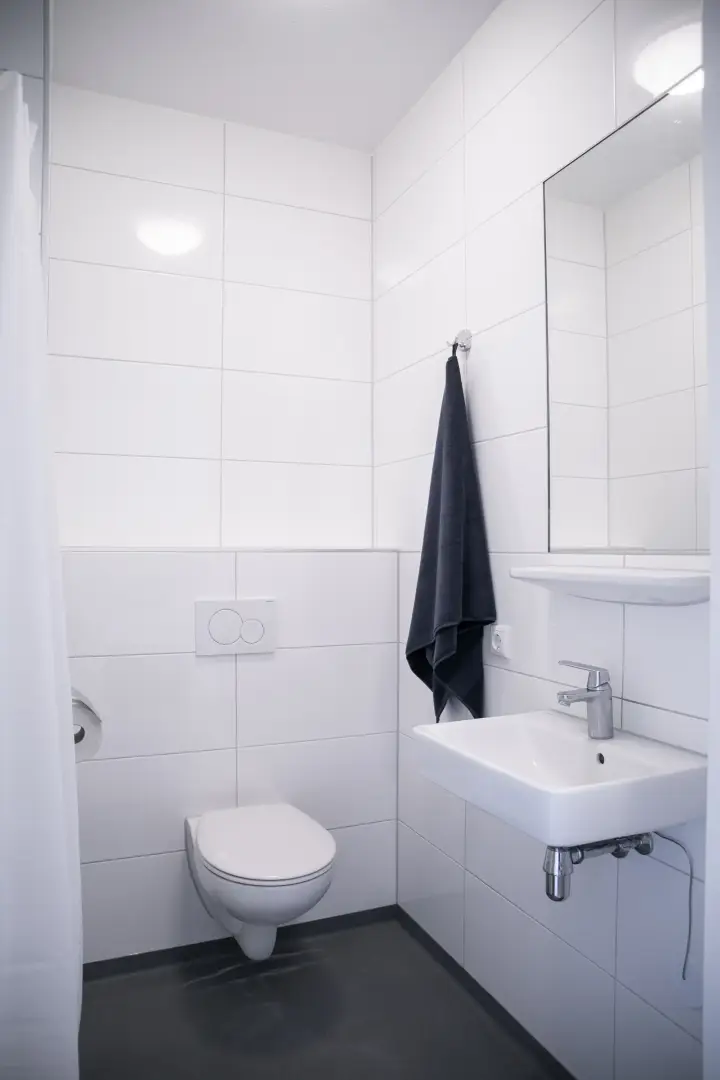 The studio has a separate bathroom with a shower, toilet, and a sink.