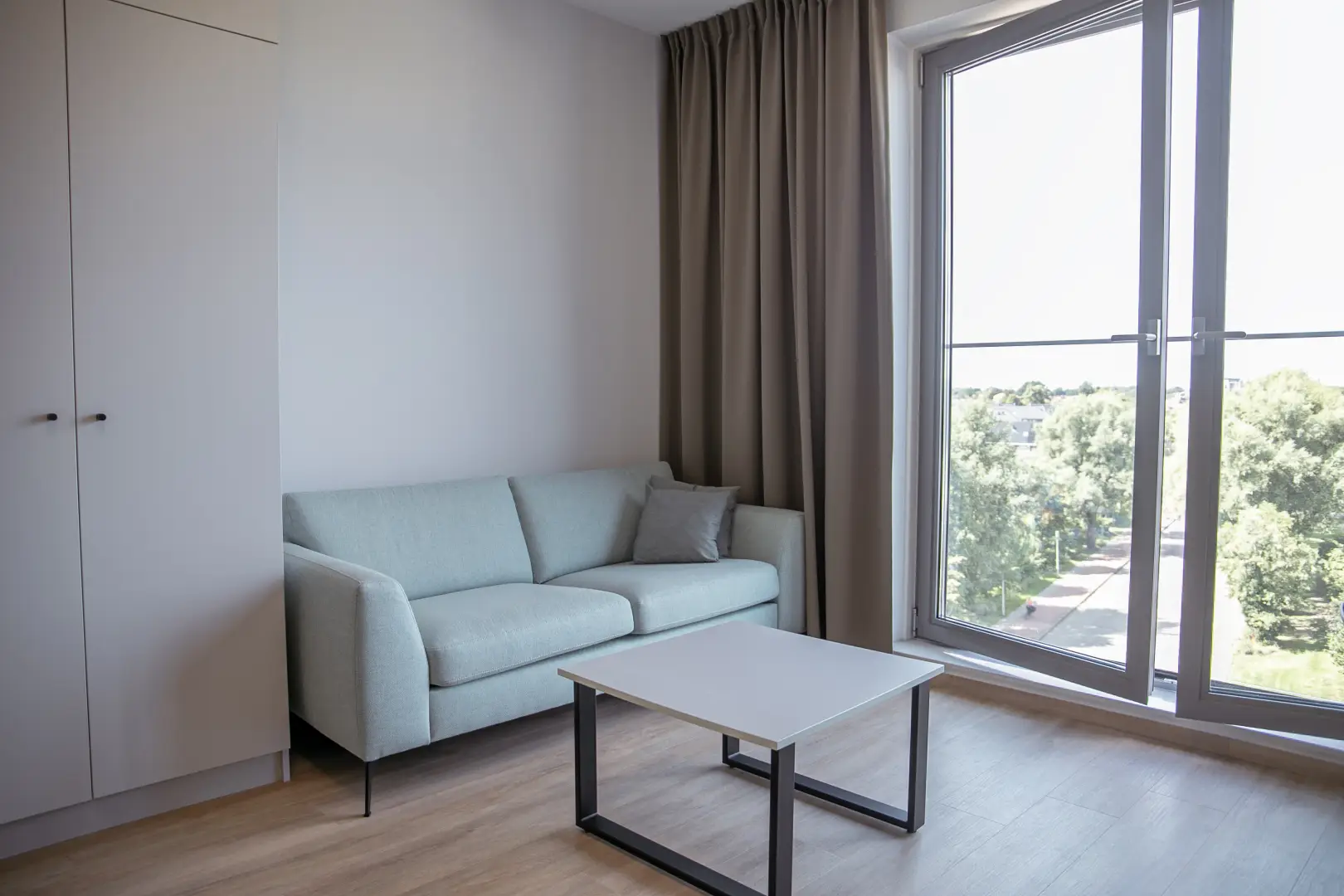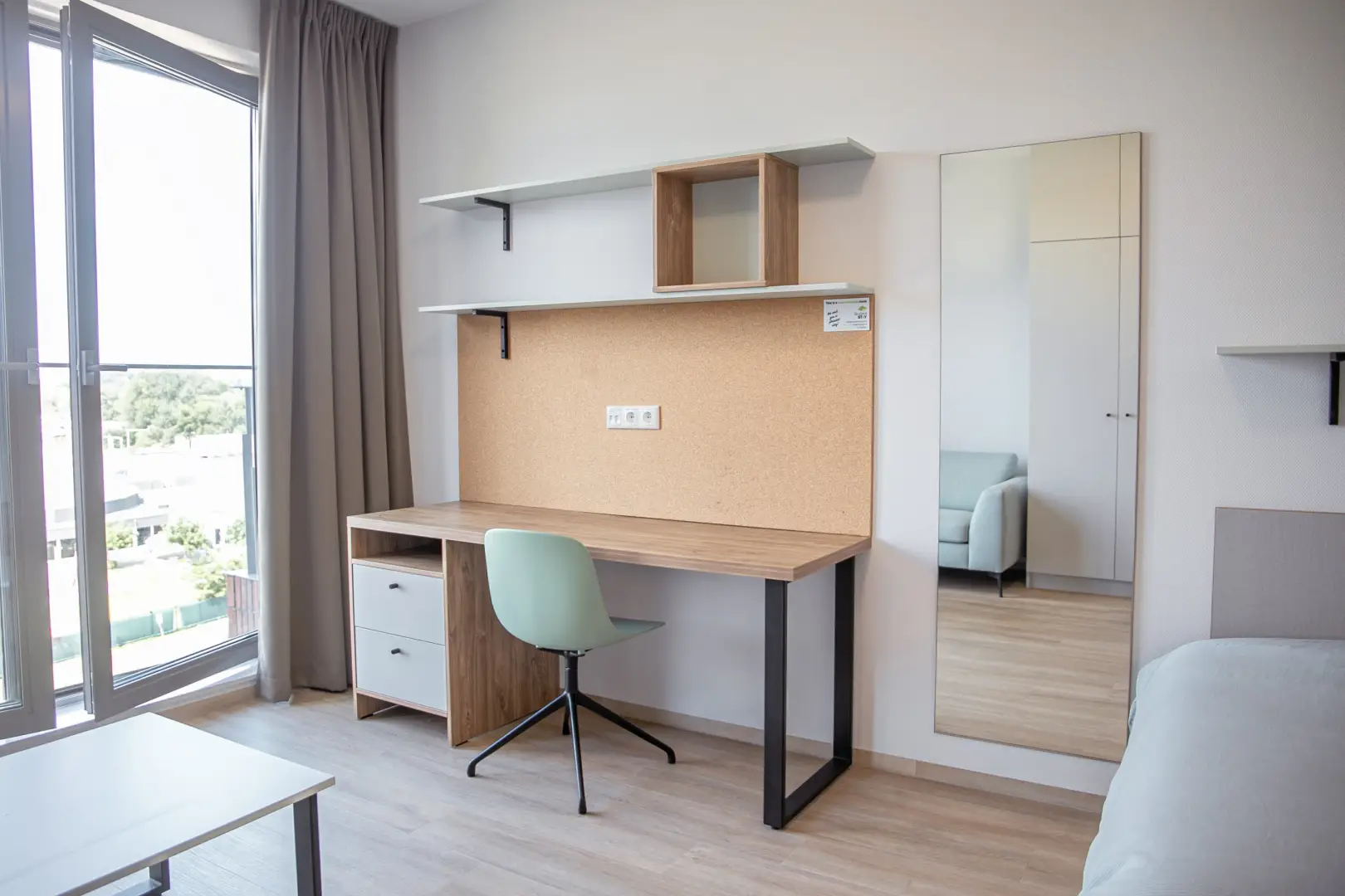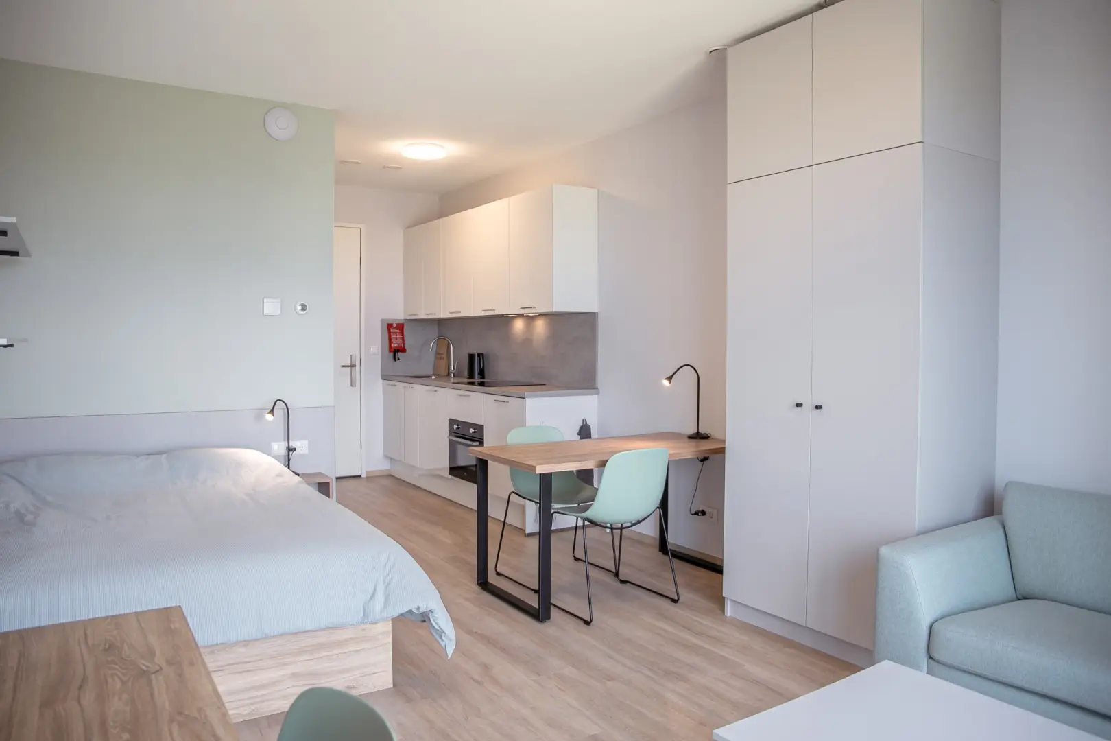 The kitchen is fully equipped with an oven/microwave-combination, stove, sink, refrigerator and a dishwasher. You won’t have to worry about cleaning dirty dishes yourself. Pots, pans and cutlery are not included. This specific Studio has nice, large, inward opening windows with a French balcony This studio has pistachio-green color elements on the wall and furniture. Please see the impression photos to get an impression of how the actual studio will look like.