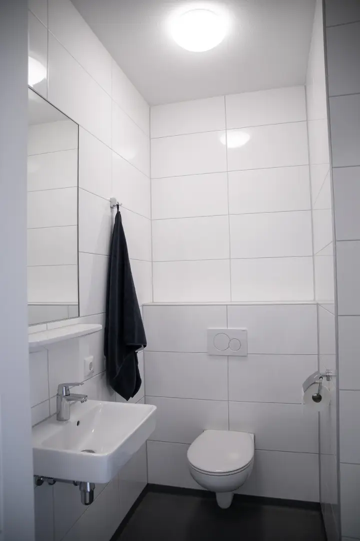 The kitchen is fully equipped with an oven/microwave-combination, stove, sink, refrigerator and a dishwasher. You won’t have to worry about cleaning dirty dishes yourself. Pots, pans and cutlery are not included.