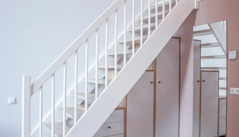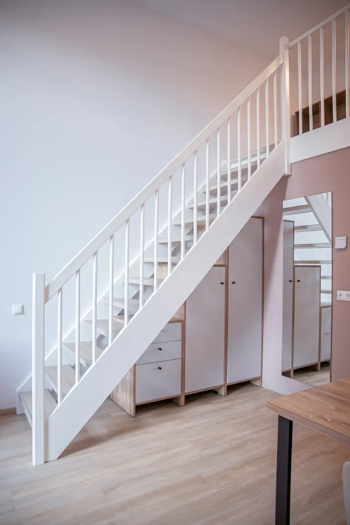 The mezzanine is equipped with a European king-size bed (160 cm x 200 cm) and has a ceiling height of 150 cm, making it a cozy yet spacious area. Beneath the stairs, you’ll find a built-in closet perfect for storing clothes and luggage.