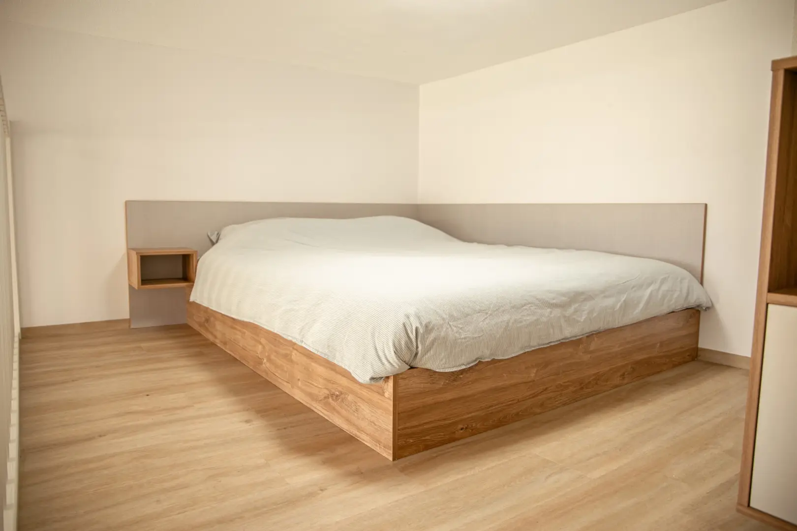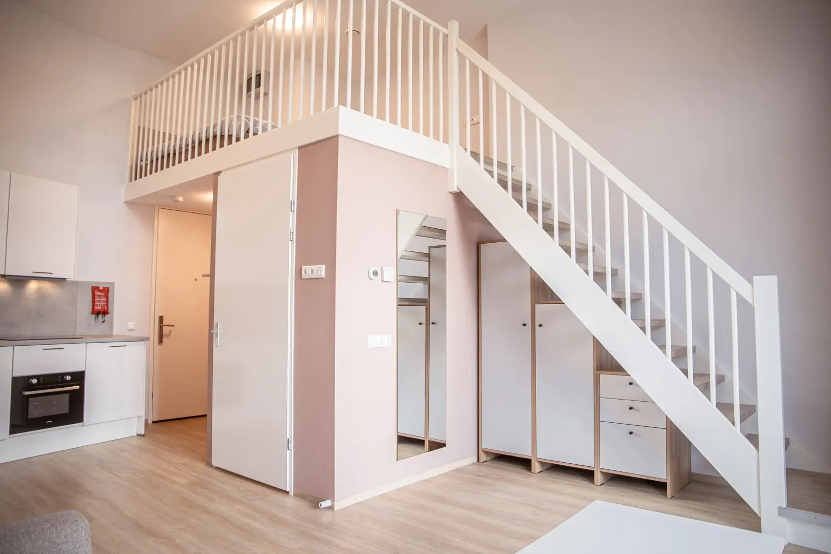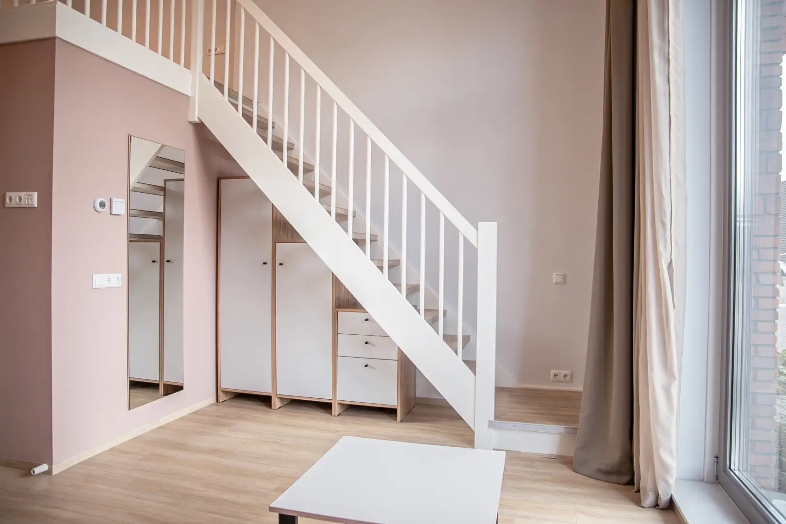 This loft has antique-rose color elements on the wall and furniture. Please see the impression photos to get an impression of how the actual loft will look like.