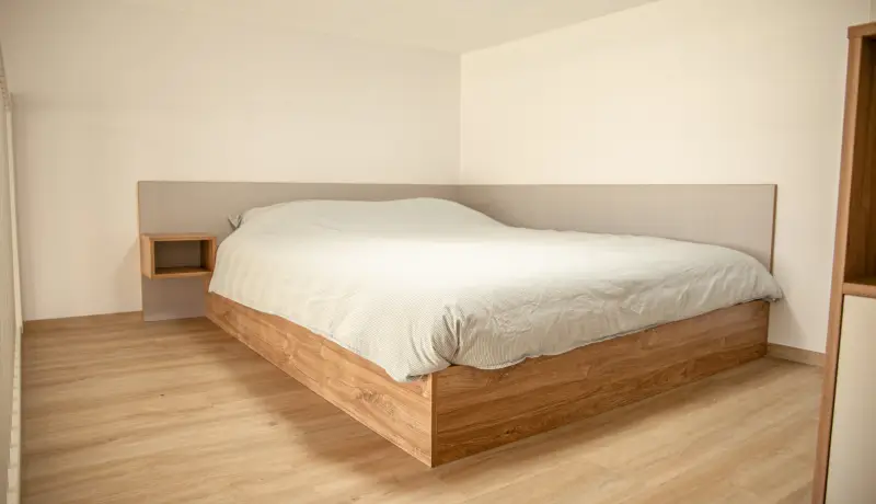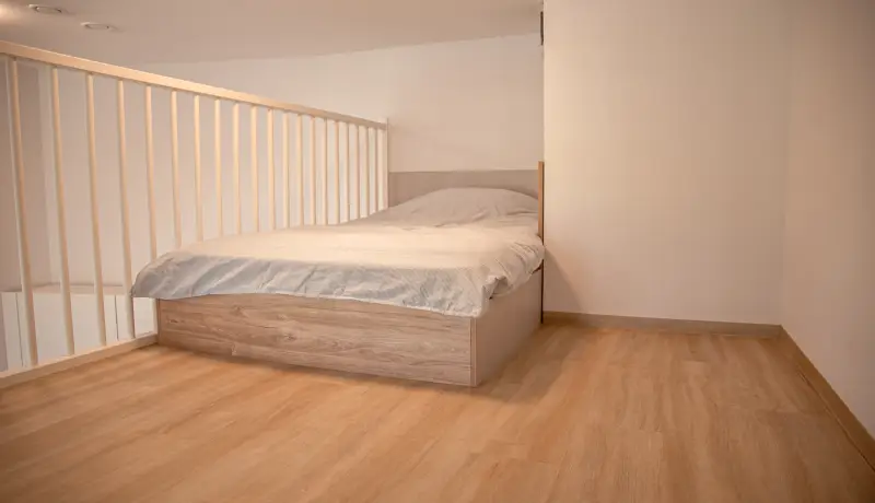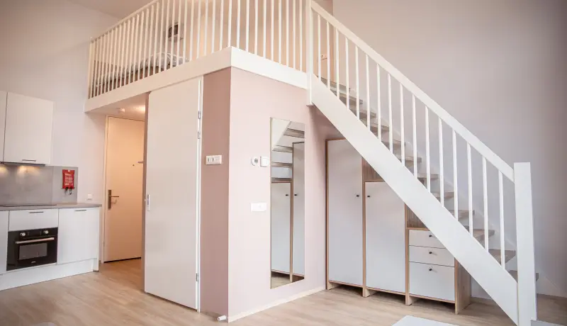 The Loft in building E is part of the campus of the NHL Stenden Hogeschool in Leeuwarden and located on the ground floor. The Loft has an extra high ceiling and is in total 4 meters high. This apartment is equipped with a living room and a kitchen on the ground floor. A stair leads to a second mezzanine floor. This floor is equipped with a European double bed and measures 140cm wide and 200cm long. The mezzanine floor is 150 centimeter high and adds a lot of extra space to this room. Beneath the stairs is a build-in closet where you can store your clothes and suitcase.