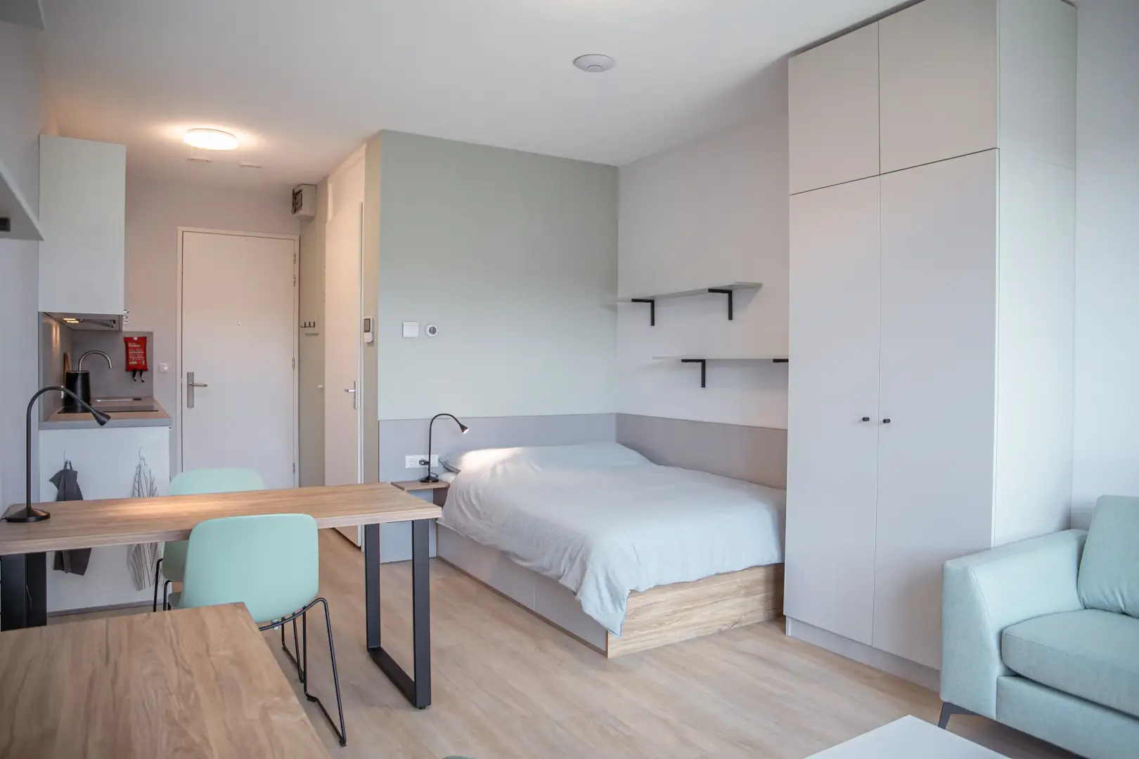 The kitchen is fully equipped with an oven/microwave-combination, stove, sink, refrigerator and a dishwasher. You won’t have to worry about cleaning dirty dishes yourself. Pots, pans and cutlery are not included. This specific Studio has nice, large, inward opening windows with a French balcony This studio has pistachio-green color elements on the wall and furniture. Please see the impression photos to get an impression of how the actual studio will look like.