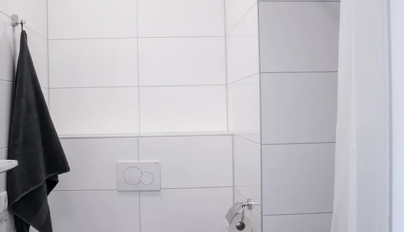 The studio has a separate bathroom with a shower, toilet, and a sink.