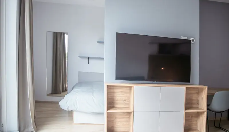 This beautiful Studio in building E is part of the campus of the NHL Stenden Hogeschool in Leeuwarden. You will find a fully furnished open kitchen, a living- and sleeping area. The Studio is equipped with a European double bed and measures 140cm wide and 200cm long. Underneath the bed you will find drawers for extra storage space. The living area of the Studio is equipped with a dining table, a large wardrobe, and a cozy couch with coffee table. The studio also contains a separate study desk with a comfortable office chair so that you can concentrate on your studies. You can also enjoy movie nights with the 55 inch smart TV in the studio.