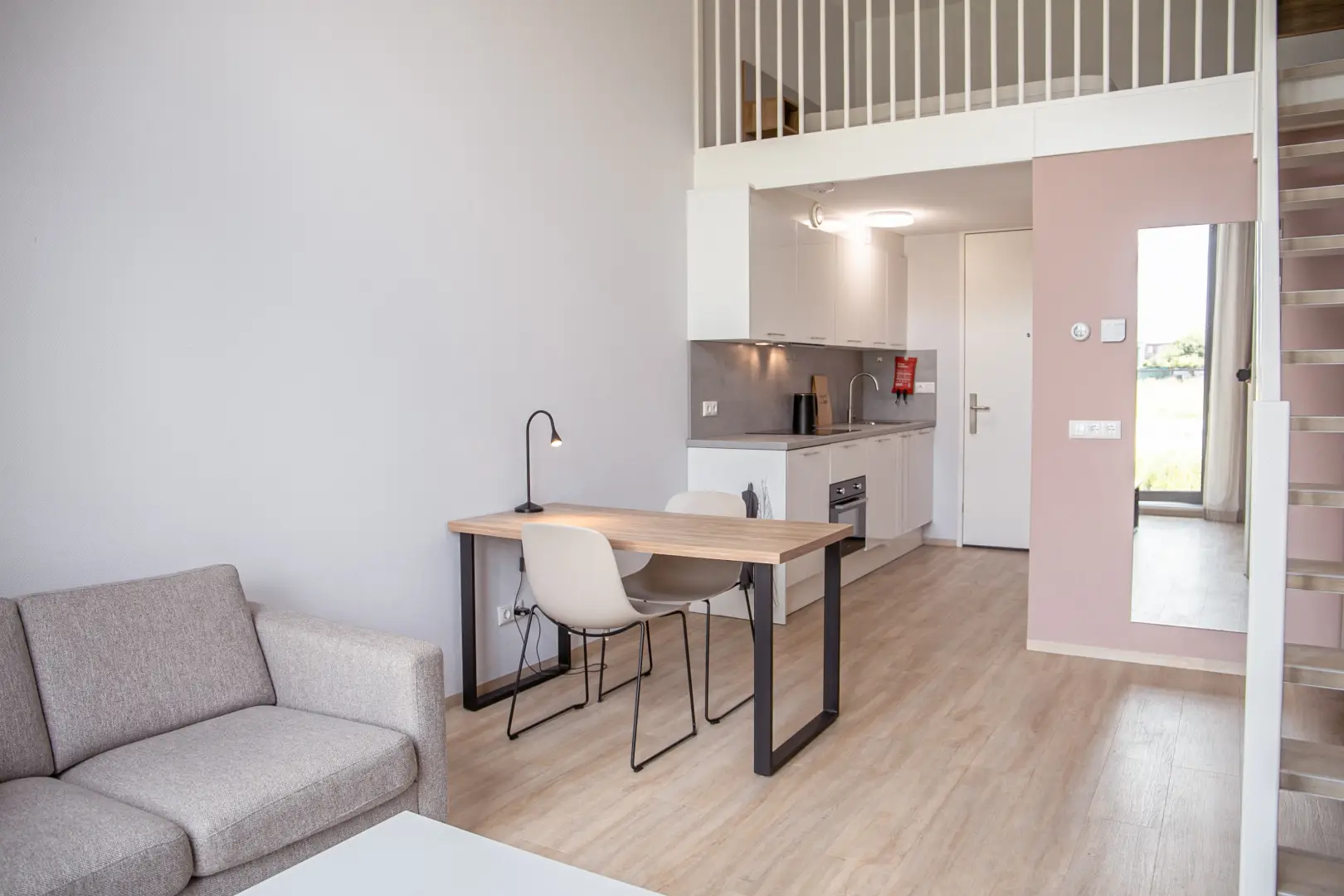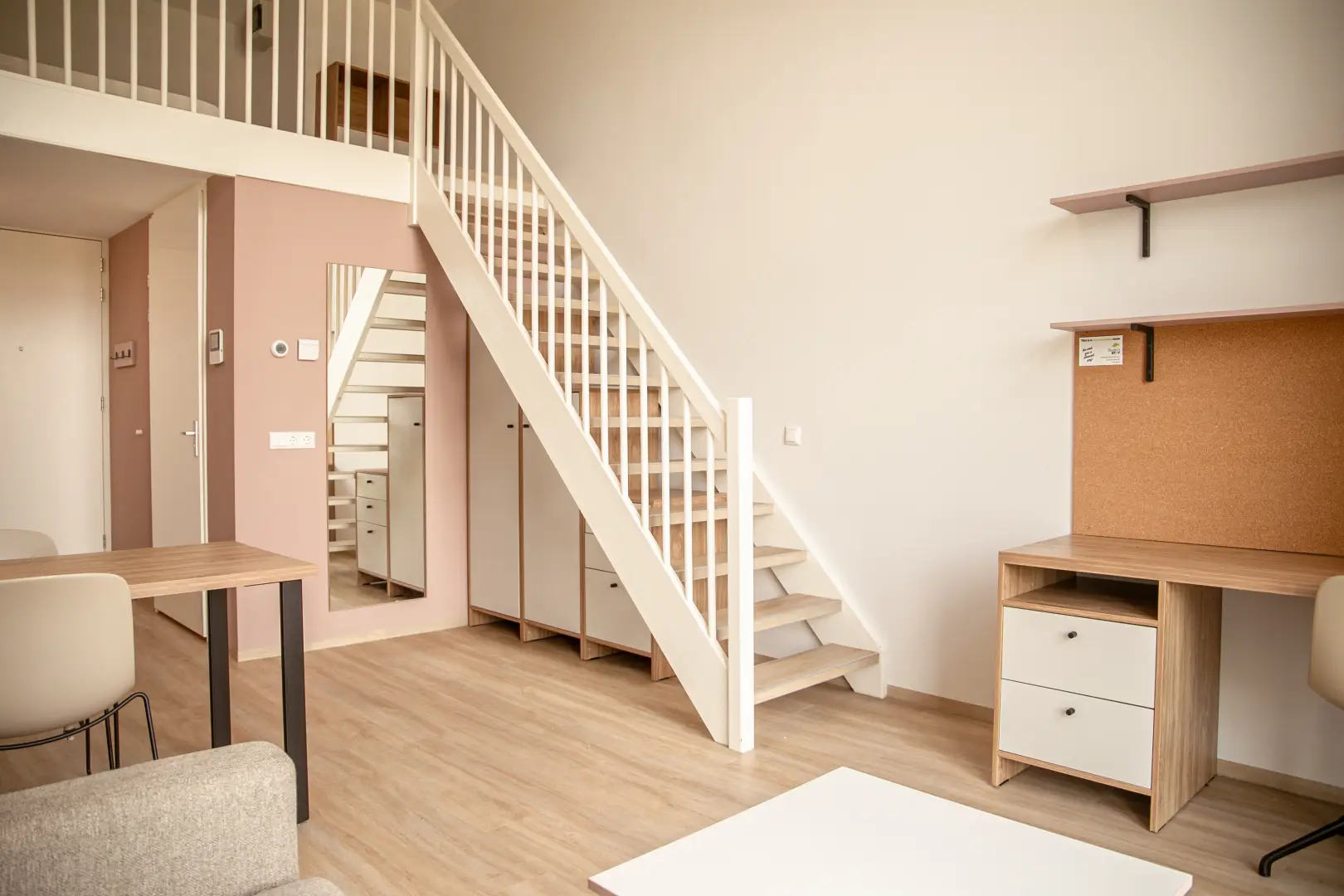 This spacious loft, located on the ground floor of Building E on the NHL Stenden Hogeschool campus in Leeuwarden, offers a modern and open living space with a striking 4-meter-high ceiling. The loft includes a living room and kitchen on the ground floor, with a staircase leading to a mezzanine level that adds extra space and functionality to the apartment.