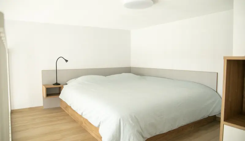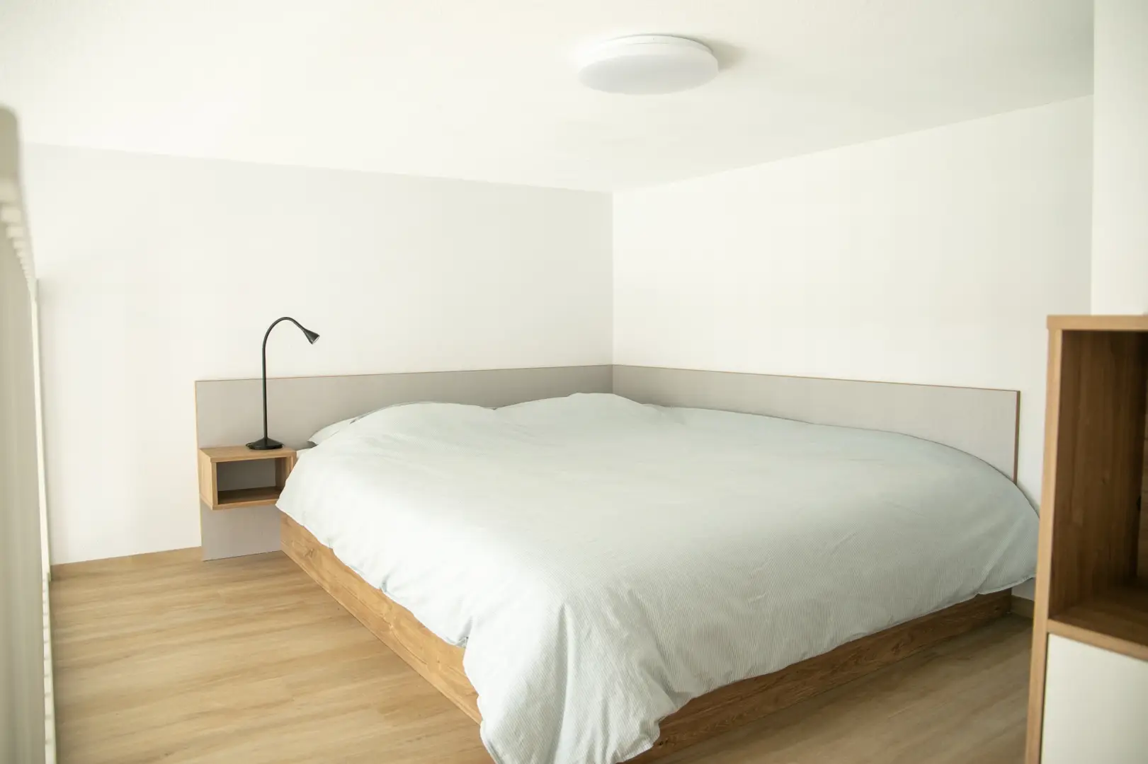 The mezzanine is equipped with a European king-size bed (160 cm x 200 cm) and has a ceiling height of 150 cm, making it a cozy yet spacious area. Beneath the stairs, you’ll find a built-in closet perfect for storing clothes and luggage.