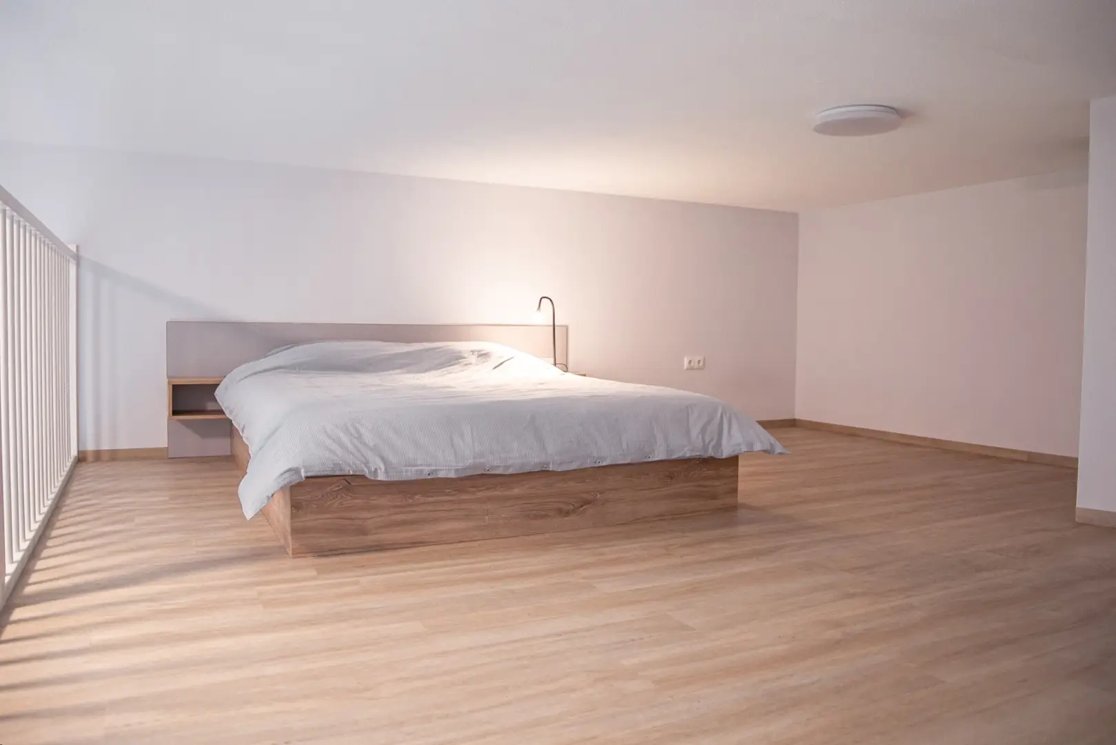 The mezzanine floor is equipped with a European king-size bed (160 cm x 200 cm) and has a ceiling height of 150 cm, adding extra space and versatility to the apartment. Beneath the stairs, you’ll find a built-in closet for storing clothes and luggage, maximizing storage space.