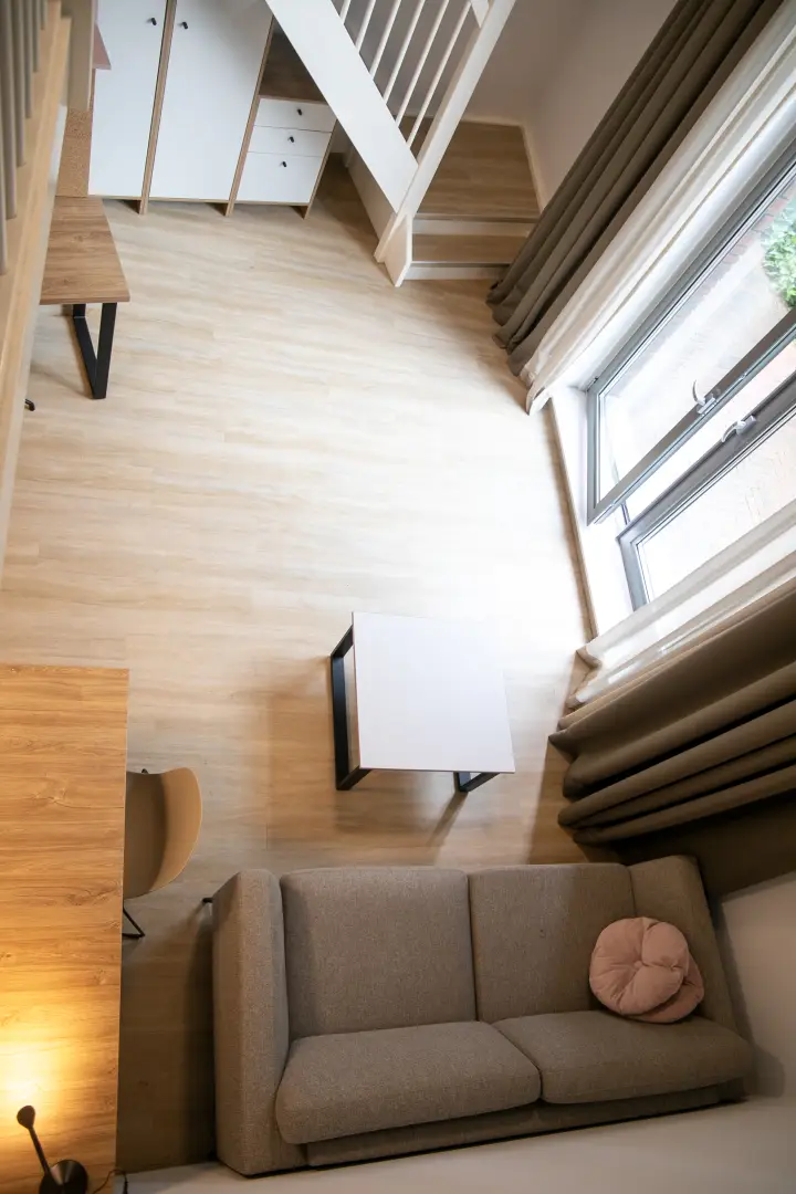 This stylish loft, located on the ground floor of Building E on the NHL Stenden Hogeschool campus in Leeuwarden, offers a spacious living environment with an impressive 4-meter-high ceiling. The loft features a living area and kitchen on the ground floor, with a staircase leading to an additional mezzanine level.