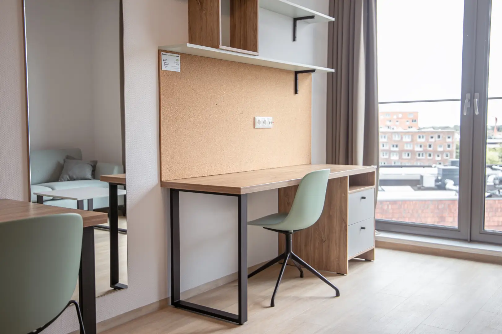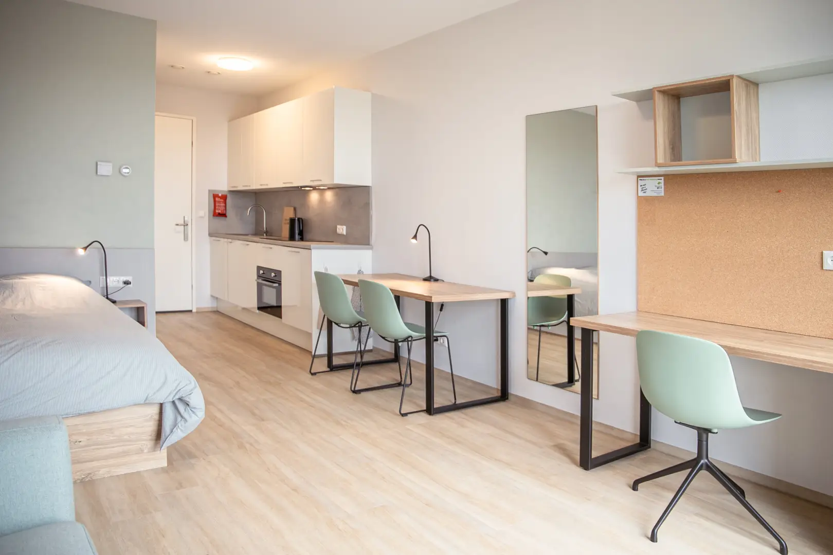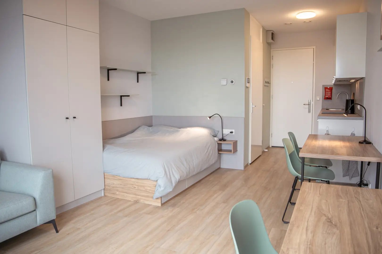 The kitchen is fully equipped with an oven/microwave-combination, stove, sink, refrigerator and a dishwasher. You won’t have to worry about cleaning dirty dishes yourself. Pots, pans and cutlery are not included. This specific Studio has nice, large, inward opening windows with a French balcony This studio has pistachio-green color elements on the wall and furniture. Please see the impression photos to get an impression of how the actual studio will look like.