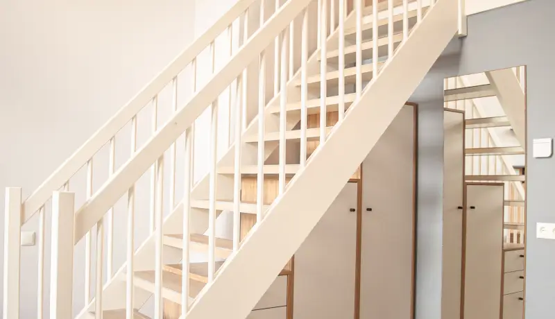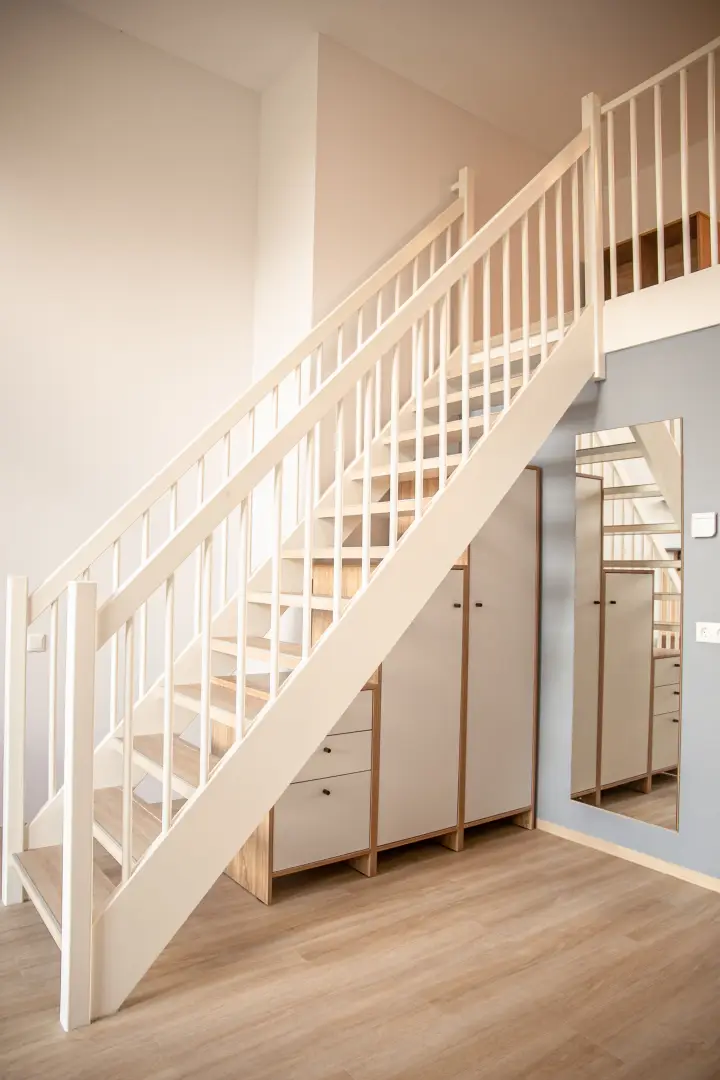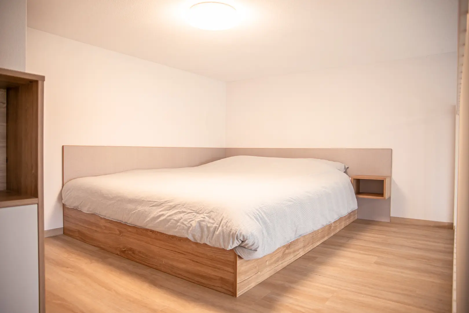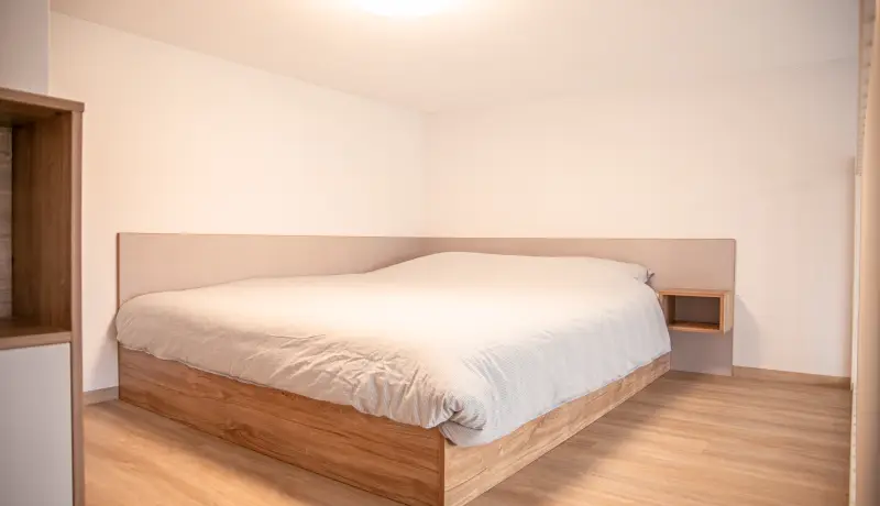 The mezzanine is equipped with a European king-size bed (160 cm x 200 cm) and has a ceiling height of 150 cm, making it a cozy yet spacious area. Beneath the stairs, you’ll find a built-in closet perfect for storing clothes and luggage.