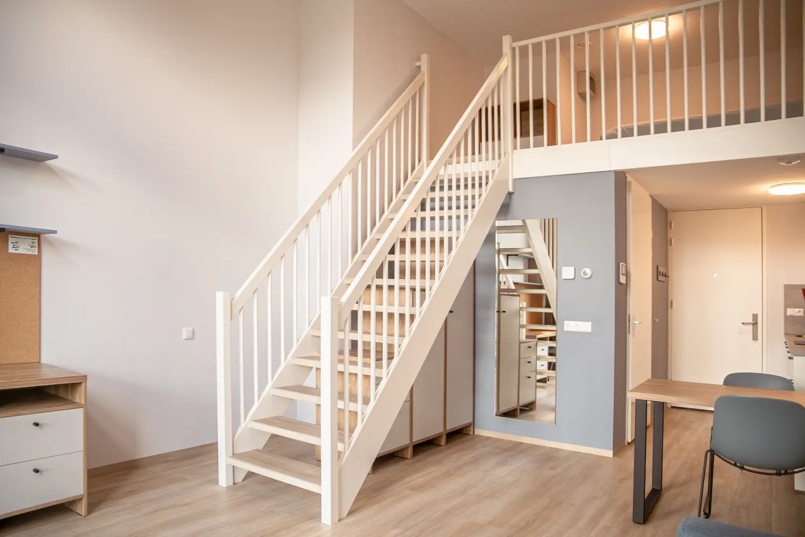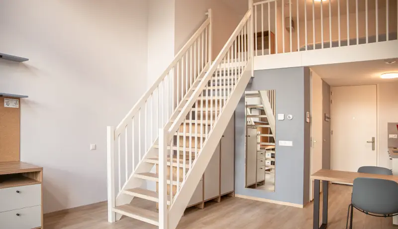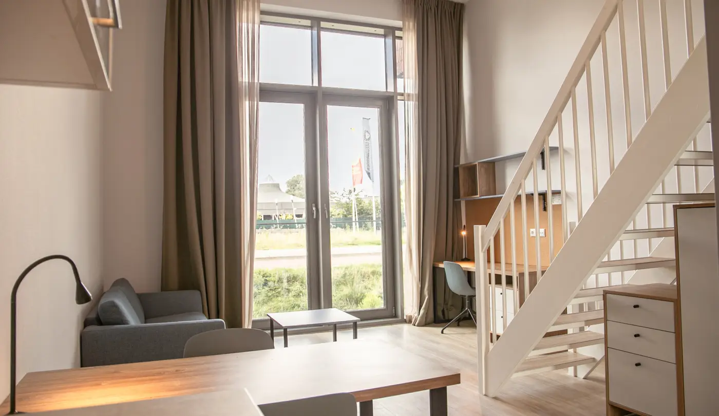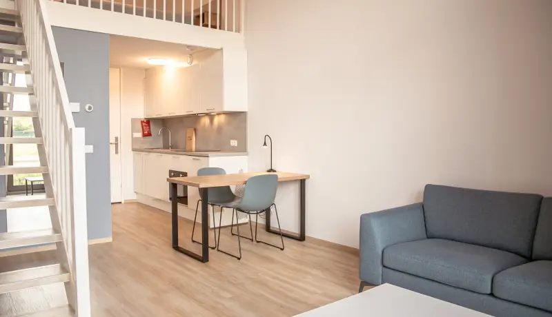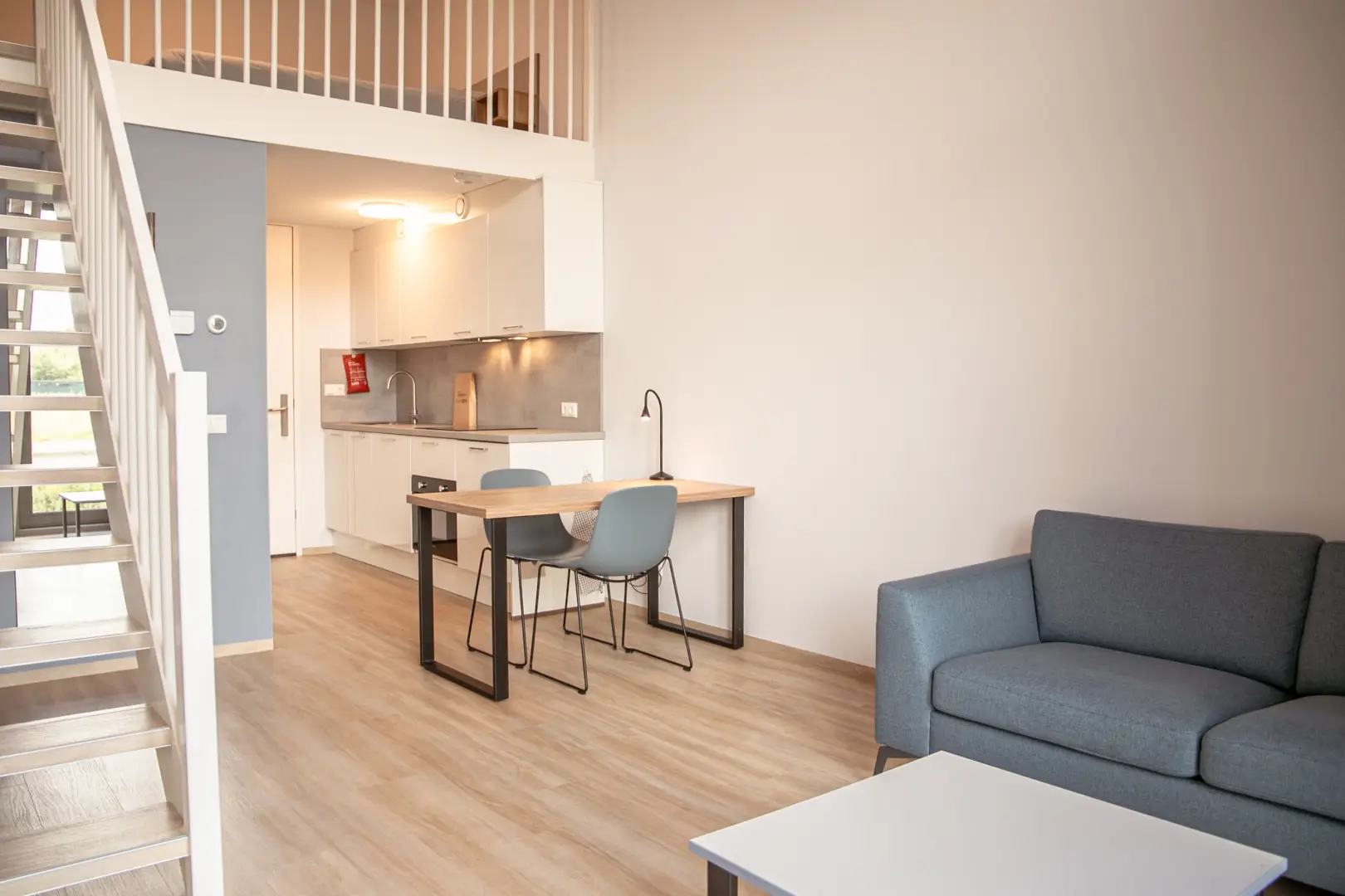 This spacious loft, located on the ground floor of Building E on the NHL Stenden Hogeschool campus in Leeuwarden, offers a modern and open living space with a striking 4-meter-high ceiling. The loft includes a living room and kitchen on the ground floor, with a staircase leading to a mezzanine level that adds extra space and functionality to the apartment.